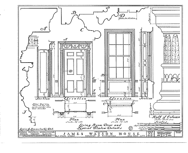 La parte oriental (1793) de la casa y en linea recta a la calle fue construida por un arquitecto desconocido, mientras que la parte occidental en forma de curva (1806) se ha atribuido a John McComb Jr.el primer arquitecto nacido americano que también participo en la construccion de Castle Clinton, y construyó el que es hoy en día el Ayuntamiento de la ciudad de NY (City Hall).