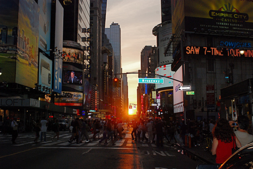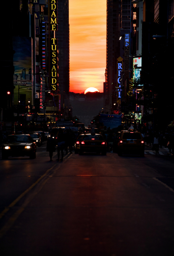 Tan solo sucede unos días al año, el 28 o 29 de mayo y el 12 o 13 de julio en los que al atardecer el sol se alinea perfectamente con la cuadrícula que forman las calles de Manhattan, de forma que se puede ver el sol poniéndose desde todas las calles pares, que van de este a oeste. Este fenómeno llamado Manhattanhenge se produce por la inclinación de 29º respecto al verdadero eje este-oeste que tienen las calles. Durante 15 minutos, desde todas las calles pares puede verse un atardecer espectacular.