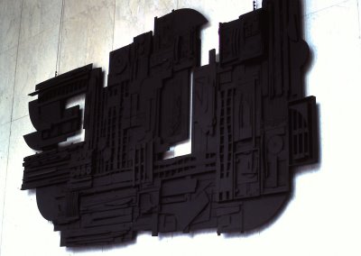 Sky Gate, New York de Louise Nevelson, un relieve en madera negra situado en el entresuelo de la Torre 1.