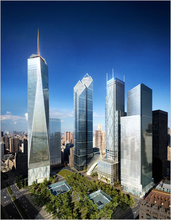 • 1 World Trade Center: conocido como  Freedom Tower o Torre de la Libertad, diseñada por Thomas Boada y David Childs. Este edificio, con un coste de 2000 millones de dólares, será el mayor rascacielos del nuevo complejo del World Trade Center. El edificio dispondrá de 104 plantas (80 de ellas ya construidas). El rascacielos tendrá una altura de 417 metros ( 541 con pináculo), el segundo más alto del mundo, después del Burj Khalifa en Dubai,  de 818 metros de altura. La altura del edificio tendrá una característica simbólica muy particular, pues sus 541 metros equivalen a 1.776 pies, cifra que resulta ser el año de independencia de los Estados Unidos (4 de julio de 1776). Además, la azotea del edificio estará situada a 417 metros de altitud, la altura exacta de las antiguas Torres Gemelas. Su inauguración está prevista para 2013.