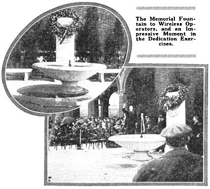 El 12 de mayo de 1915, el monumento estaba listo para su inauguración. La fuente fue cubierta por la bandera de Estados Unidos y coronado con una corona de flores. A pesar de la lluvia, más de 500 personas asistieron a la ceremonia. McAneny, la alcaldesa en funciones habló del heroísmo de los operadores inalámbricos y mencionó a los dos operadores  que habían perdido la vida en el Lusitania cinco días antes. Tras el discurso, el monumento y la fuente fueron descubiertos.
