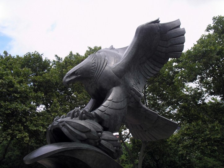 La pieza central del monumento es un águila de bronce monumental esculpida por Albino Manca, escultor de origen italiano El águila esta situada sobre un pedestal de granito negro pulido. A sus pies una corona de laurel sobre una ola simboliza la muerte en el mar.