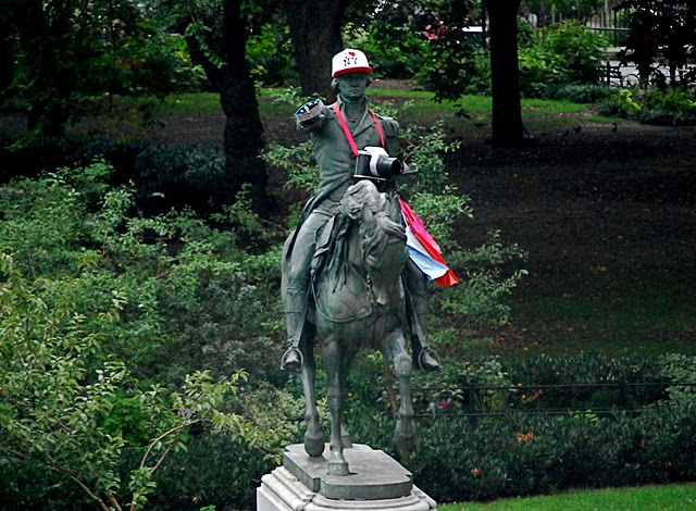 El pasado sábado, y de forma excepcional, la estatua ecuestre del general George Washington, situada en Union Square, pudo contemplarse ataviada con los atuendos propios de cualquier turista que camina por la Gran Manzana.