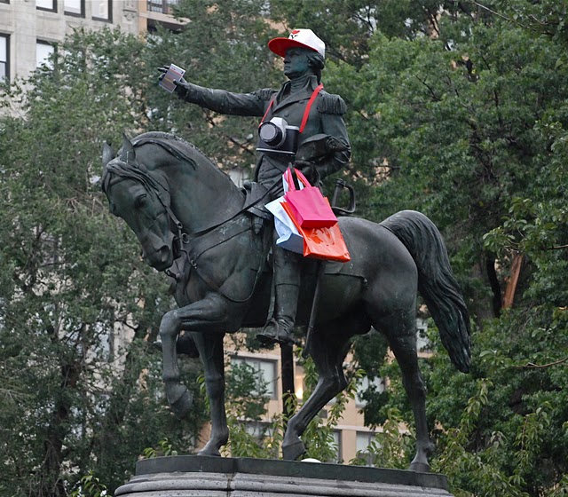 La estatua del general portaba un mapa del metro en su mano derecha, una gorra con el logo turístico de Nueva York, bolsas con compras, y por supuesto una cámara para hacer muchas fotos.