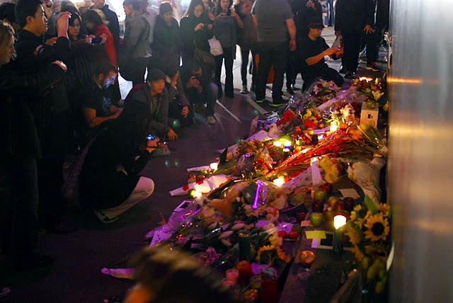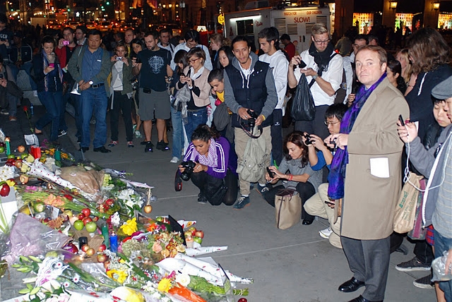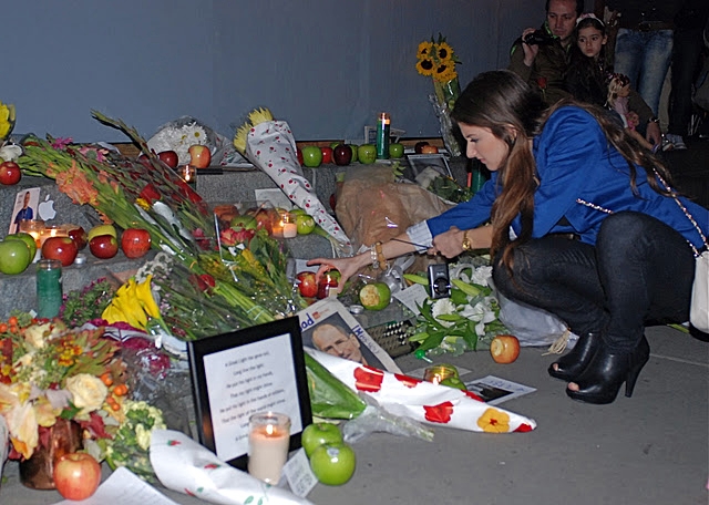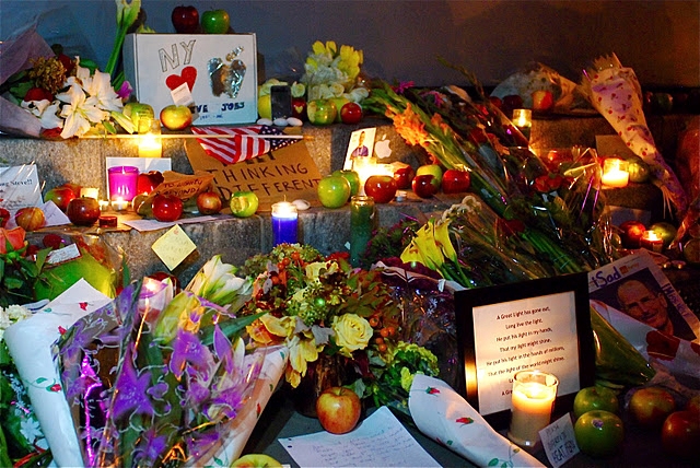 En Nueva York, los admiradores de Apple han improvisado un pequeño altar, frente a la Apple Store de la Quinta Avenida, en memoria de Steve Jobs. Decenas de flores, velas, manzanas, globos, notas, banderas o fotografías recuerdan a este genio de la informática fallecido a los 56 años.