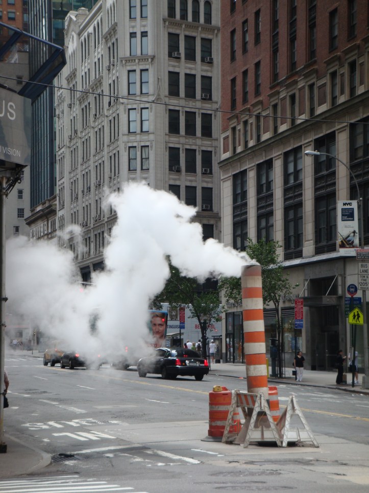 En realidad, no se trata de humo sino de vapor de agua. Este vapor proviene del sistema de calefacción de la ciudad y de fugas en las conducciones de agua, que al entrar en contacto con las tuberías de vapor provocan este efecto.