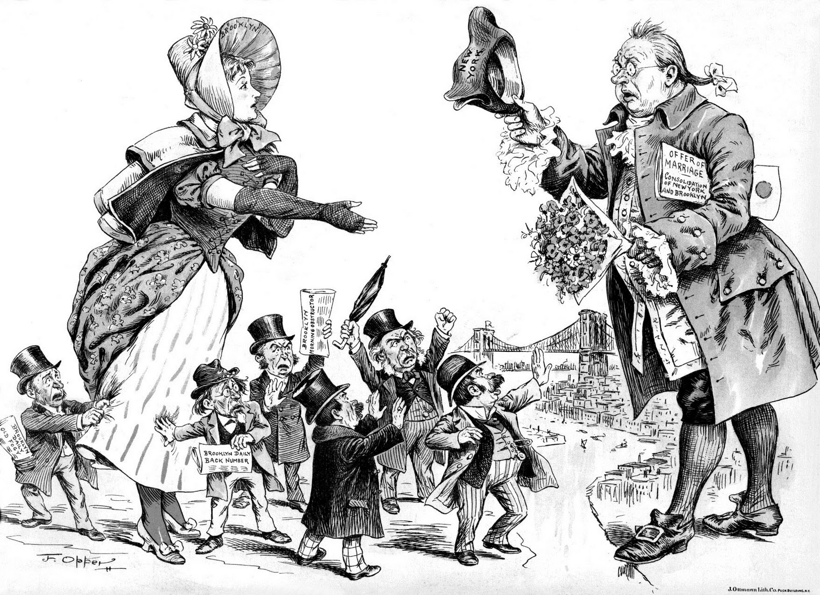 La caricatura, publicada en 1893, muestra a Father Knickerbocker (una figura alegórica que representaba a Nueva York en aquella época) proponiendo matrimonio a una atractiva dama, “Miss Brooklyn”, que representa a Brooklyn. A los pies de esta, se encuentran caricaturizados los editores de periódicos y lideres cívicos de Brooklyn que se oponían a la unión de ambos condados. A pesar de la unión, Brooklyn continua manteniendo en la actualidad una fuerte identidad propia.