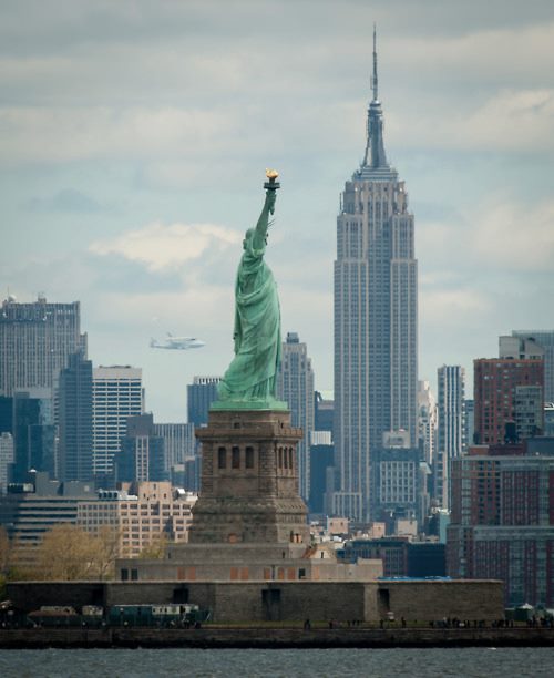 En su aproximación al aeropuerto internacional John F. Kennedy, el transbordador voló a baja altitud a lo largo del río Hudson para alegría de una enfervorizada multitud de curiosos agolpados en sus orillas.