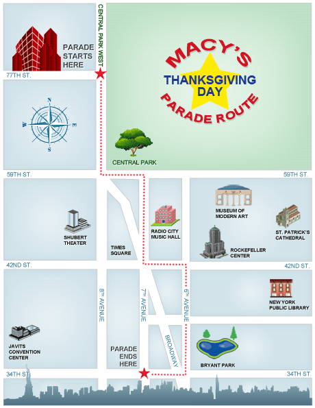El desfile comienza a las nueve de la mañana en la calle 77 con Central Park West, junto al Museo de Historia Natural, continua bajando hasta Columbus Circle, para luego seguir por Broadway hasta llegar a los almacenes Macy’s, en la calle 34 con la Séptima avenida. Espectaculares carrozas y globos gigantes con forma de personajes famosos son los protagonistas del desfile.