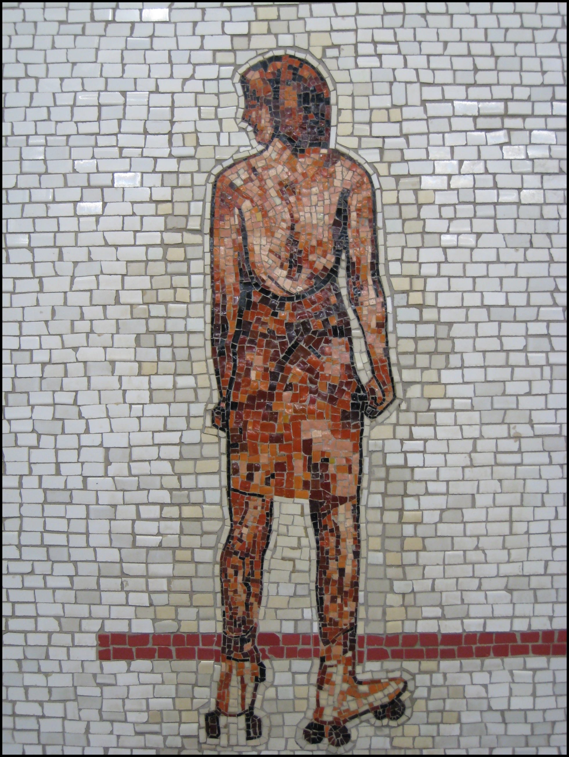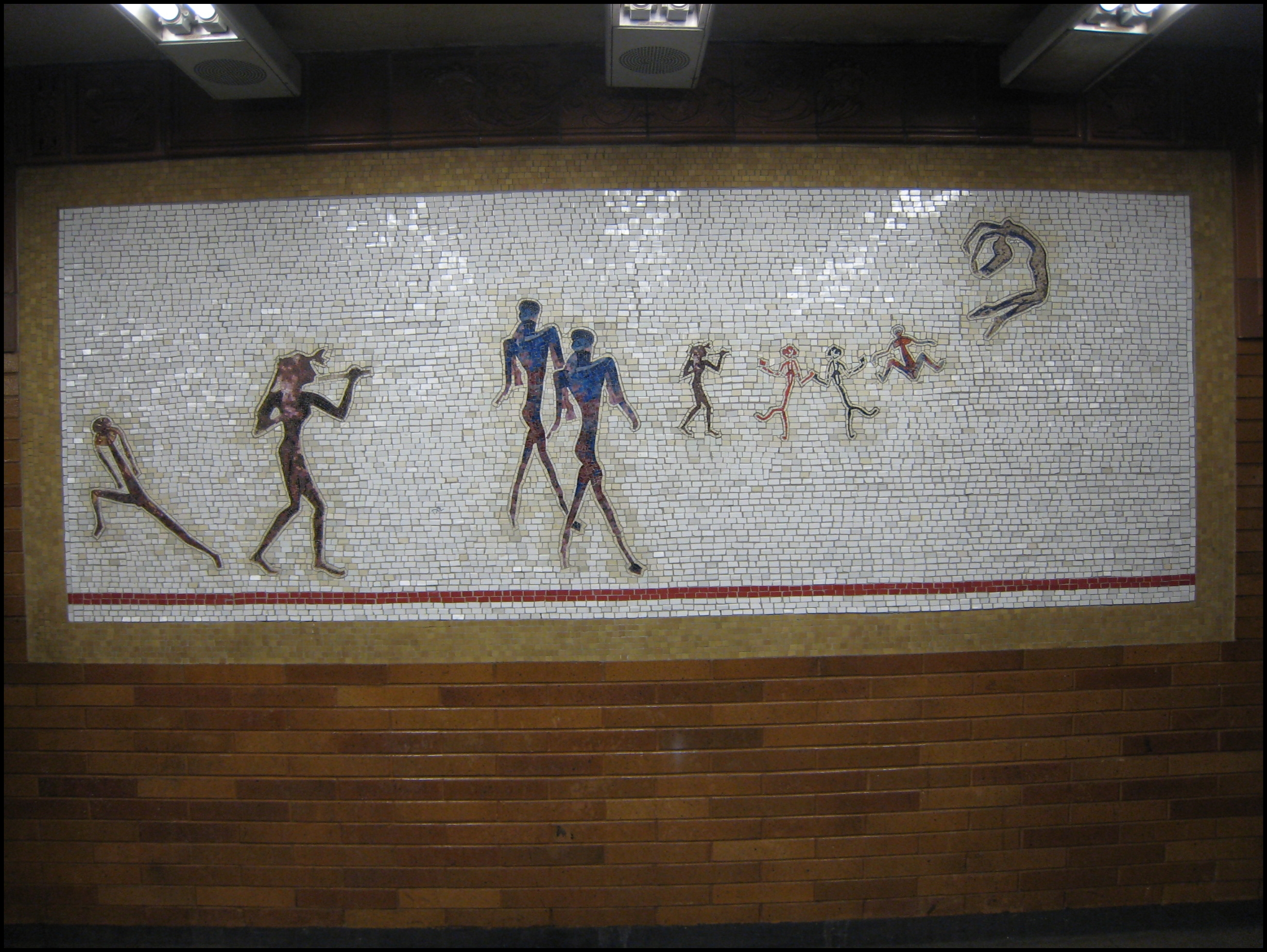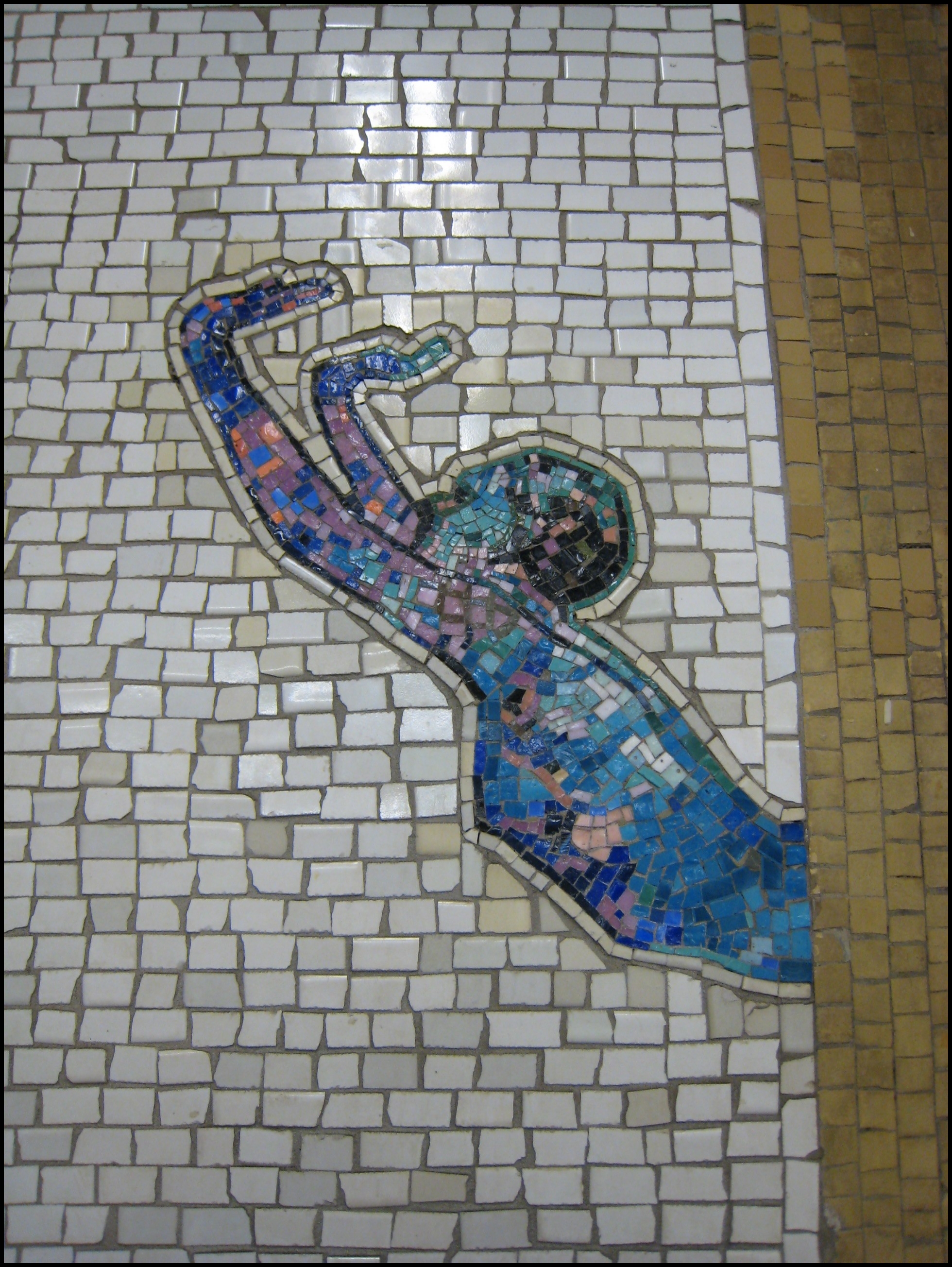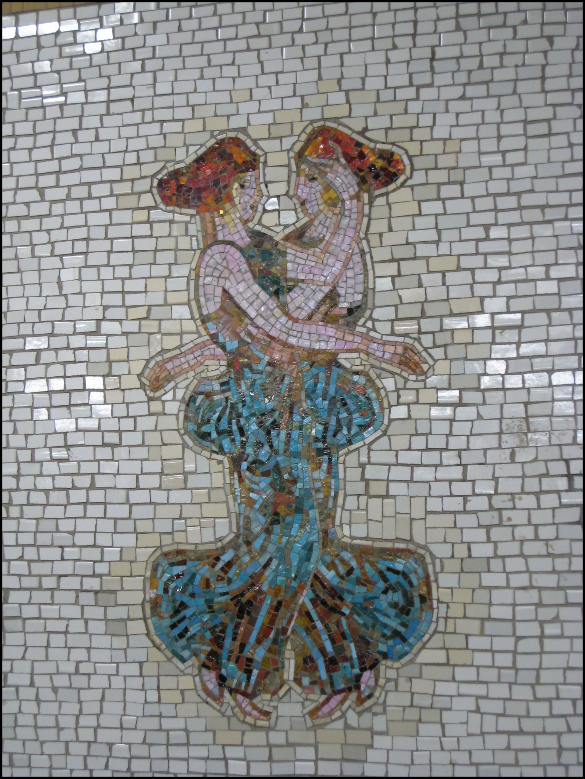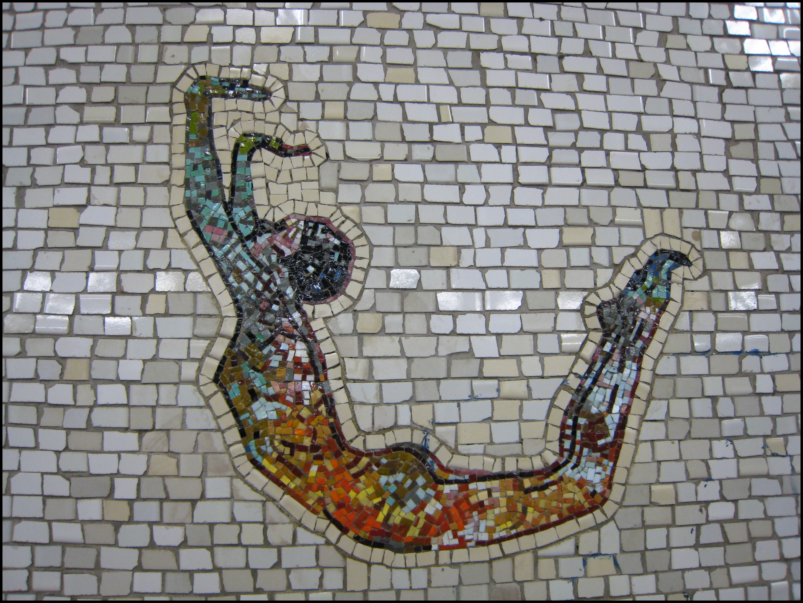 «Artemis, Acrobats, Divas and Dancers«, una serie de 22 coloridos mosaicos creados por Nancy Spero en 2001. Los mosaicos, de ceramica y vidrio, fueron instalados en la estación de la calle 66 – Lincoln Center en 2004.