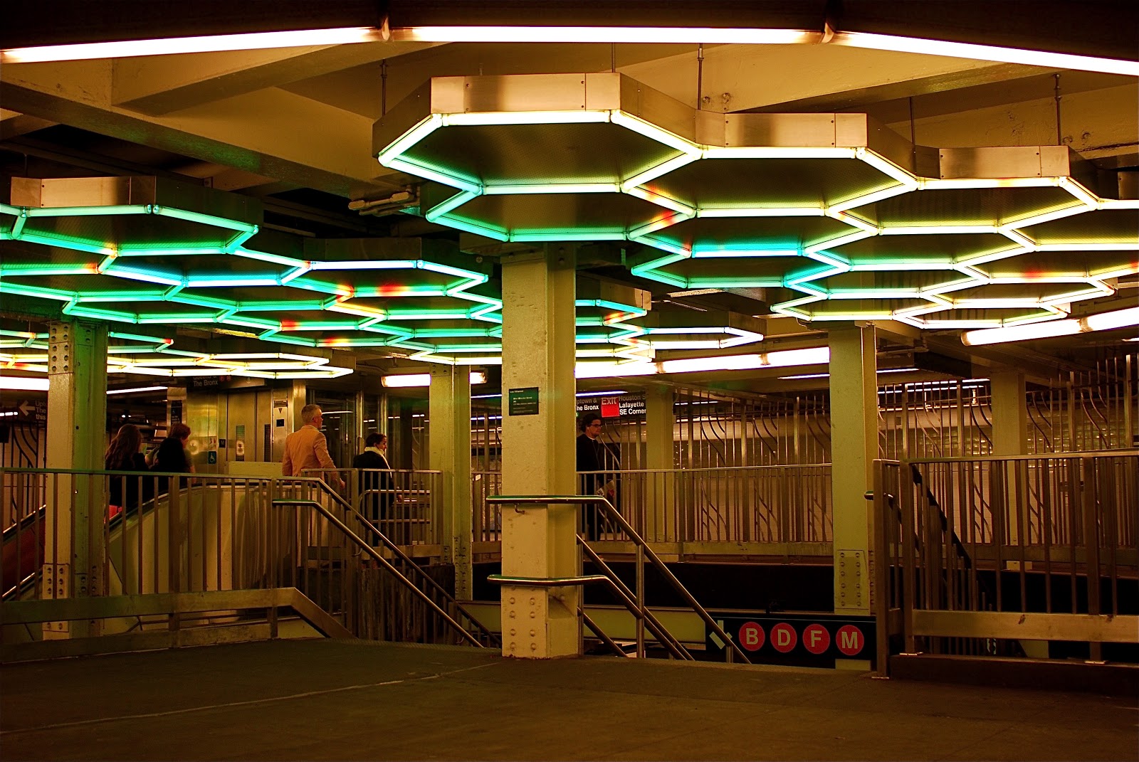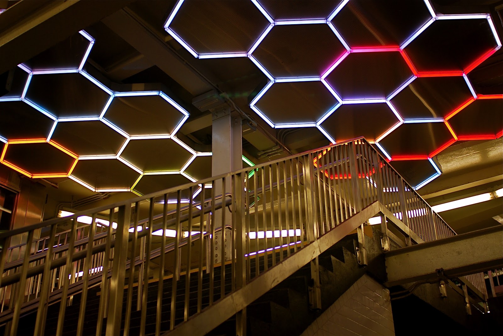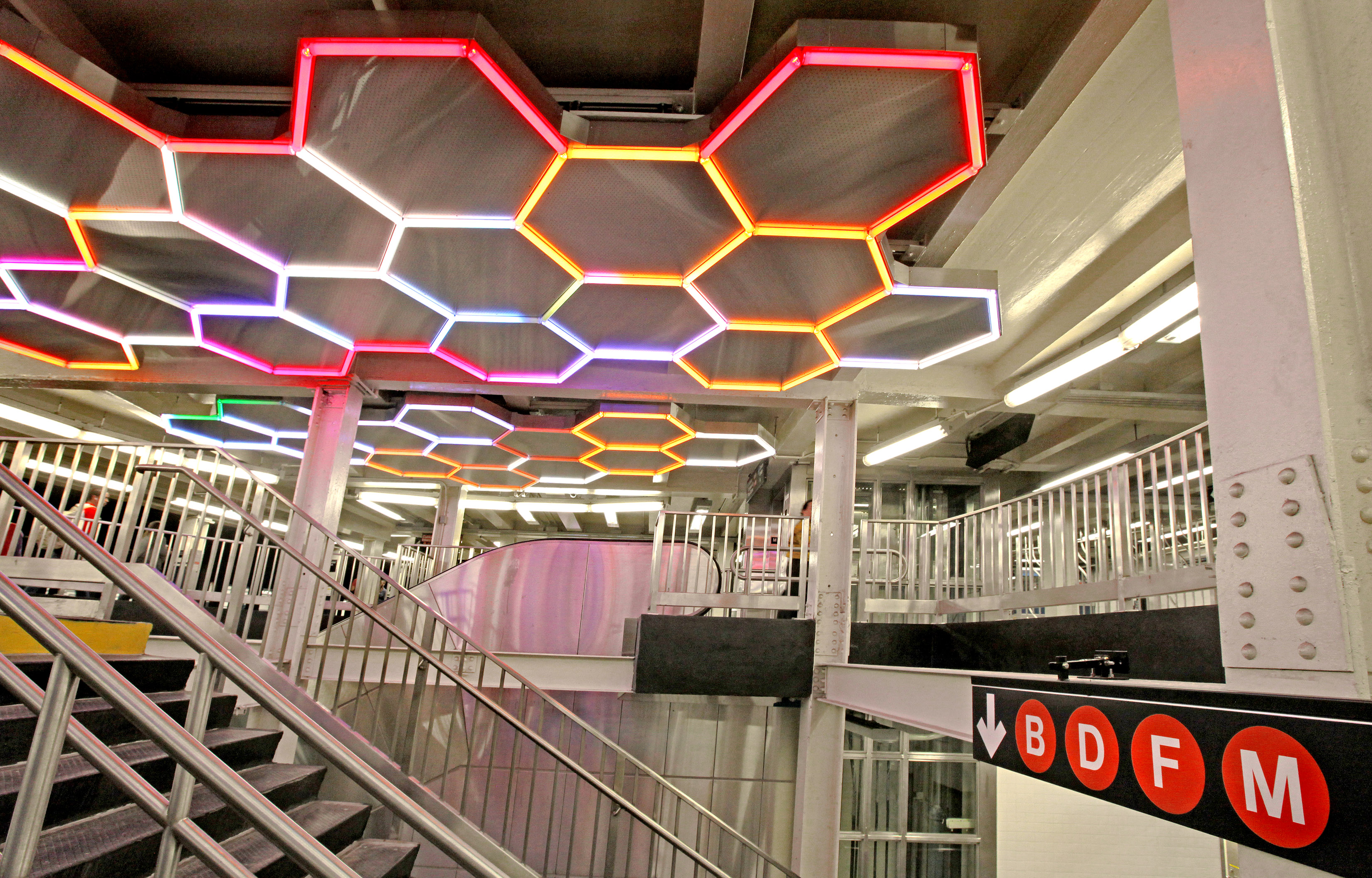 HIVE, creada igualmente utilizando tubos LED y figuras hexagonales, permanece instalada en la estación de la calle Bleecker desde 2012.