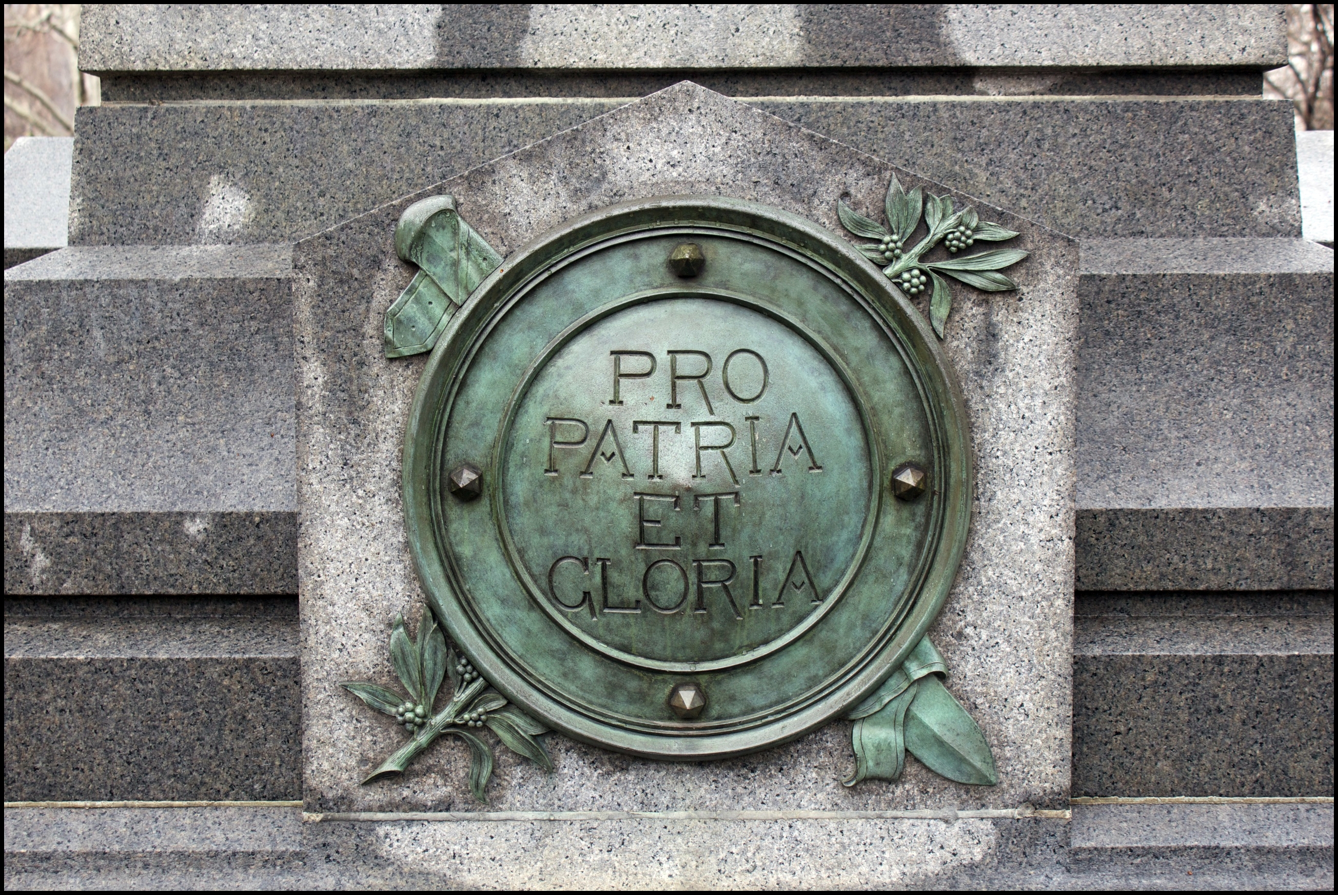 En los cuatros lados de la base, sendas placas de bronce donde aparece inscrito el      lema del regimiento: «Pro patria y gloria» (Para el país y la gloria).