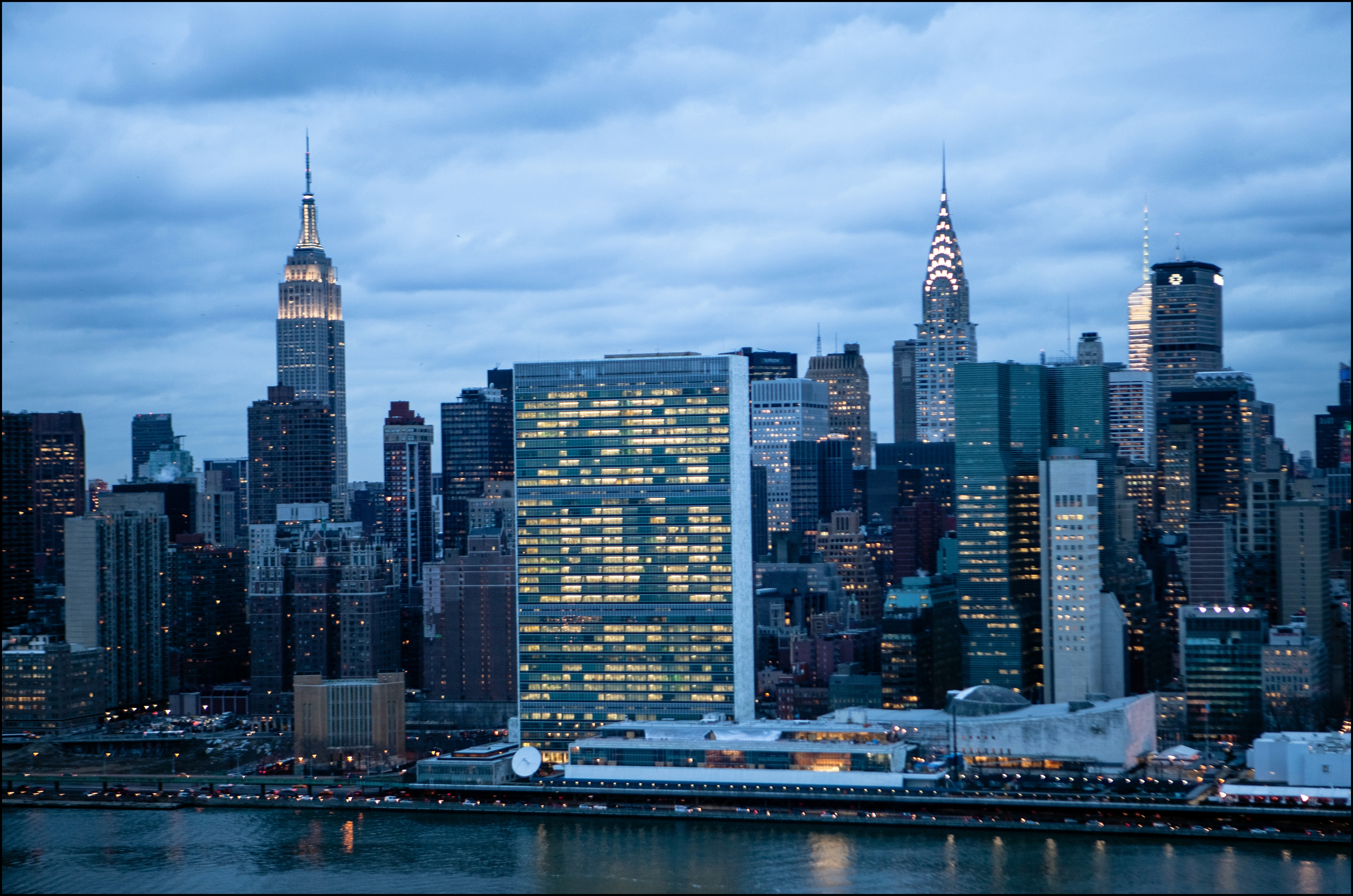 Esta impresionante instantánea, captada desde Roosevelt Island, nos muestra tres icónicos edificios neoyorquinos. Sus dos rascacielos más famosos: Empire State y Chrysler «escoltan» el complejo que alberga la Sede de la Organización de las Naciones Unidas (ONU), situada a orillas del East River.
