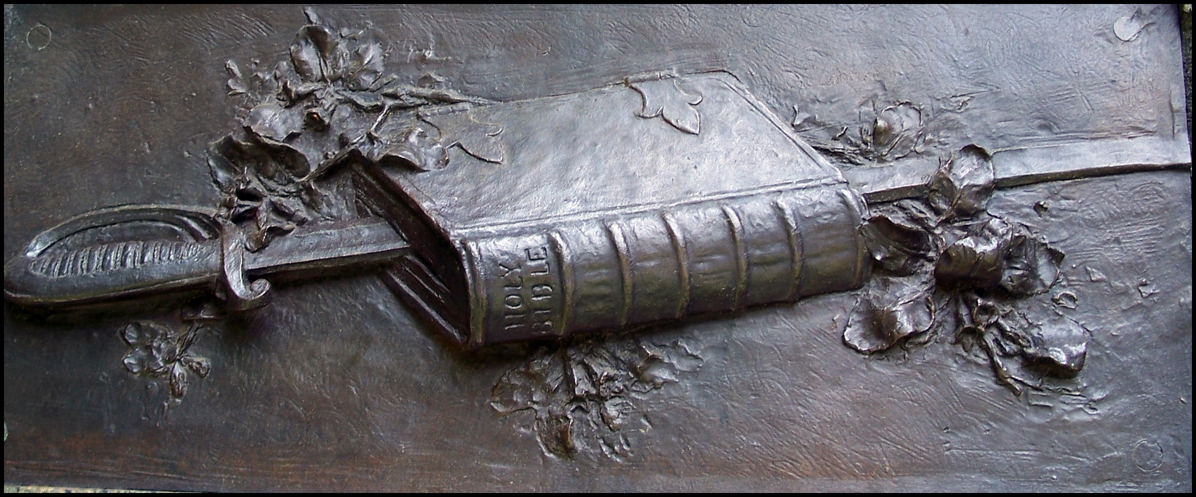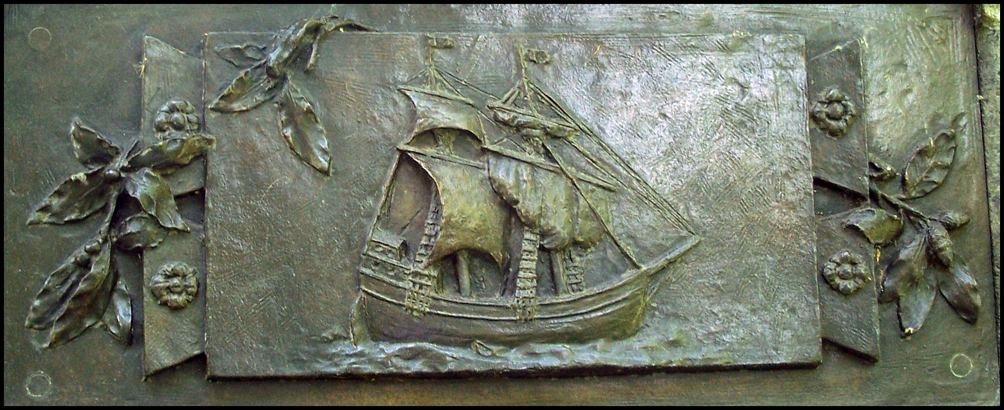 Sobre el aparecen colocadas cuatro placas de bronce con bajorrelieves que representan aspectos significativos de la llegada de los primeros peregrinos, como el barco ‘Mayflower’, la Biblia, y la espada.