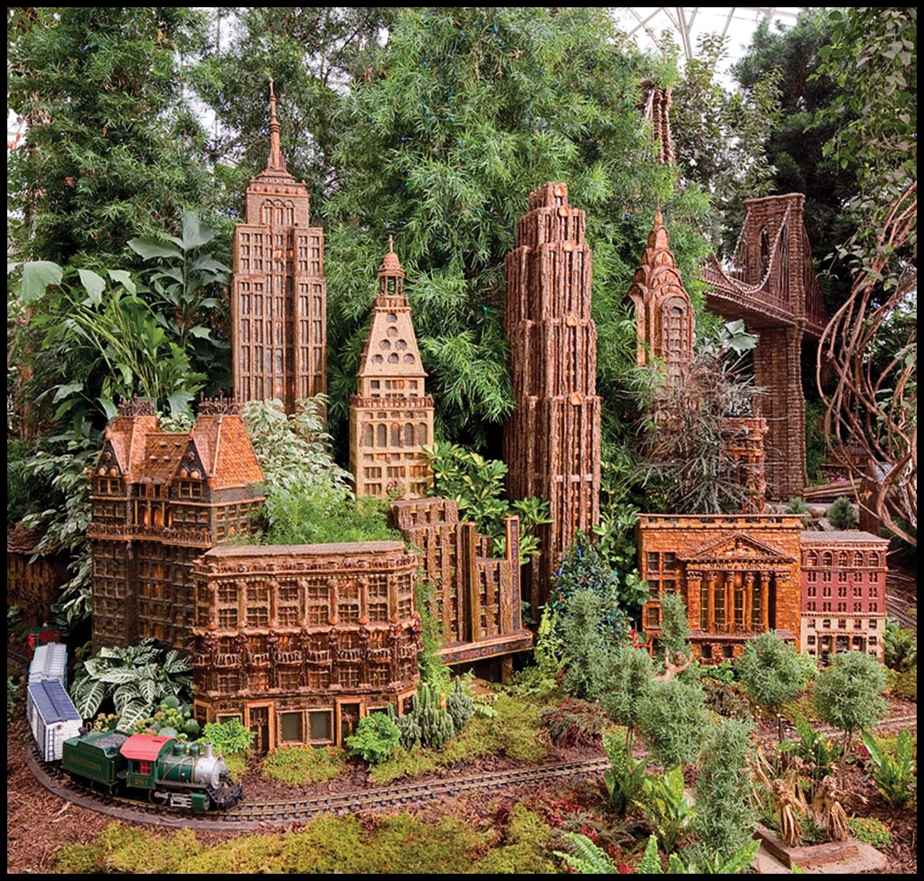 Con la reproducción de 140 edificios y lugares representativos de la City. Entre ellos, la Estatua de La libertad, el Puente de Brooklyn, el Edificio Chrysler, el Arco de Washington, el City Hall, Rockefeller Center, MET, Catedral de San Patricio o Ellis Island. Todos ellos elaborados con materiales vegetales.