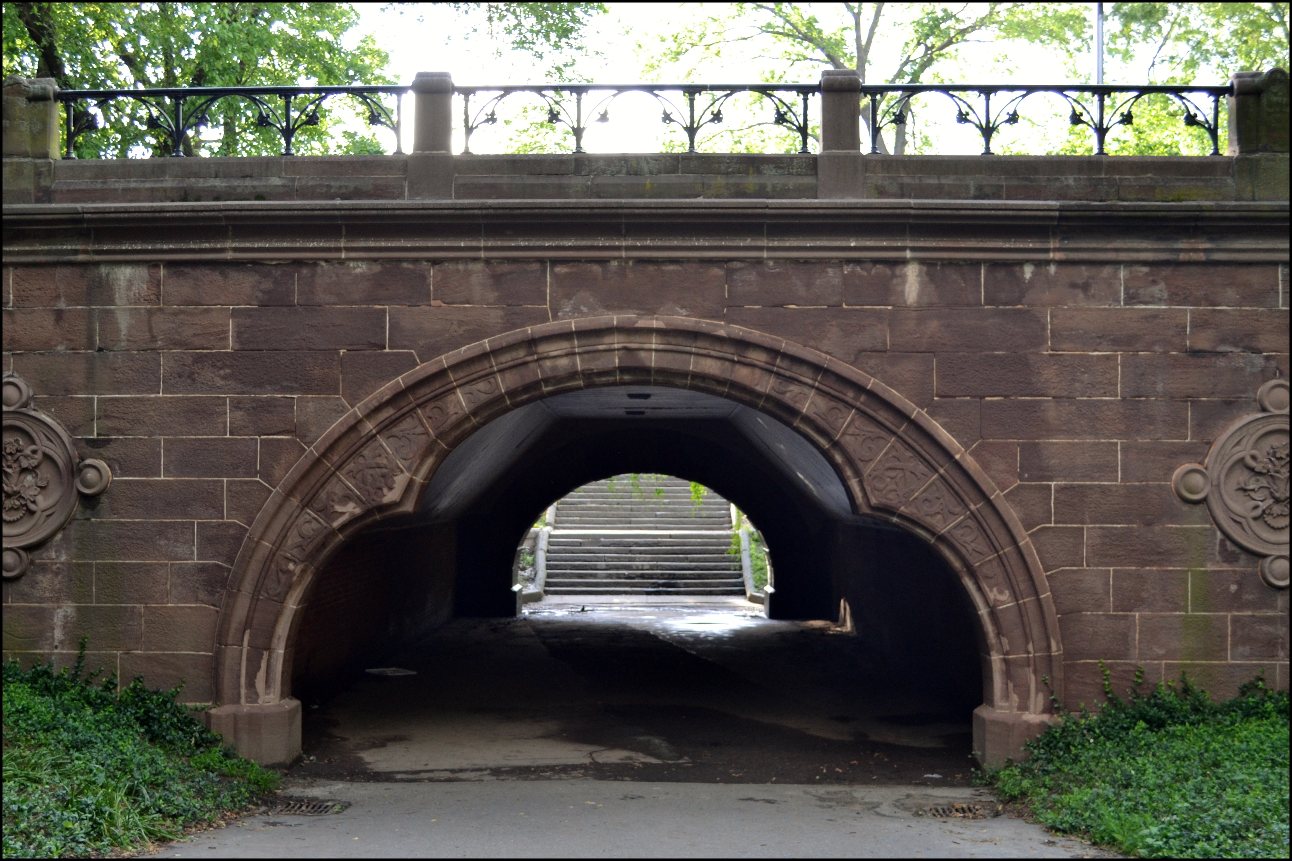 Ubicado a la altura de la calle 73, el Trefoil Arch (Arco trébol) destaca por su diseño único. Su lado este es de estilo gótico, con un arco formado por tres lóbulos que le dan apariencia de trébol (de ahí su nombre). Sendos medallones con adornos florales completan la decoración. Su cara oeste, en cambio, cuenta con un arco redondo y curvo y piedras en forma de cuña.