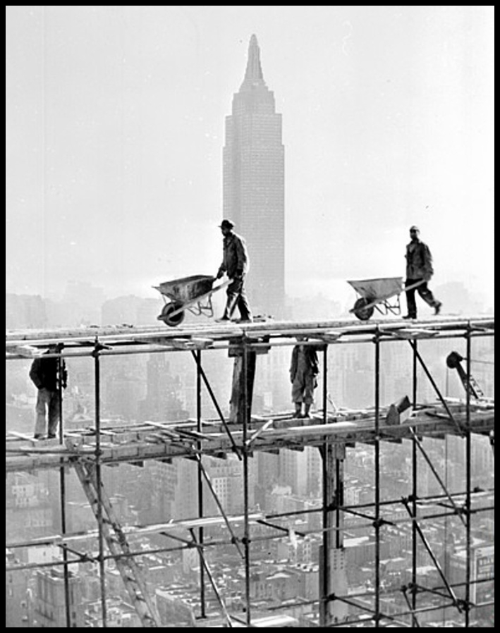 Magnifica Foto, los obreros trabajando sobre el andamiaje en un primer plano y la bruma calinosa envolviendo la majestuoso Building y la ciudad !!