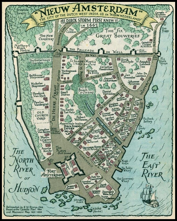 En la parte superior del mapa, bajo el nombre de la ciudad, podemos leer: «As Dirck Storm first knew it in 1662» (Como Dirck Storm la conoció por primera vez en 1662). Me pregunté quién sería esa persona, y tirando un poco del hilo, descubrí que se trataba de un destacado miembro de la comunidad holandesa.