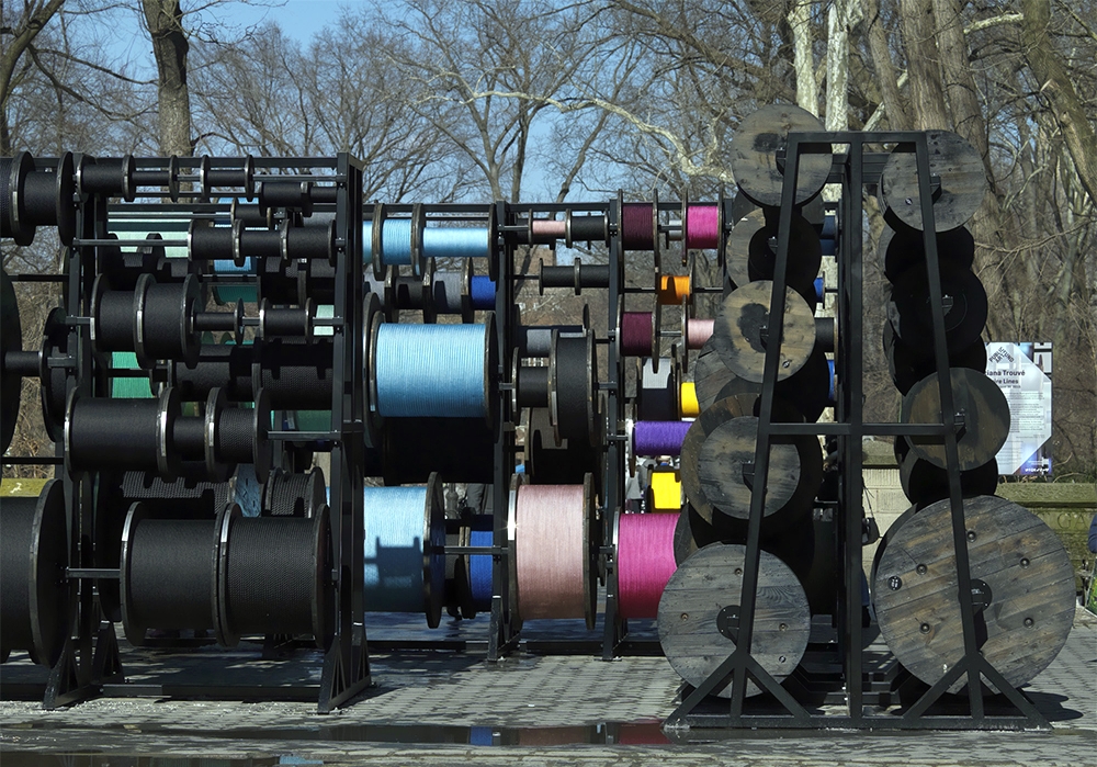 Su propósito era representar esta información de manera tridimensional. Para ello… construyó tres grandes bastidores que sostienen un total de 212 carretes. Cada bobina contiene una cuerda con una longitud equivalente a una vía. Su ubicación en el parque aparece marcada mediante una etiqueta.