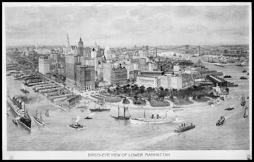 Este bonito grabado de 1915 nos muestra una vista elevada de la zona sur de la isla de Manhattan.