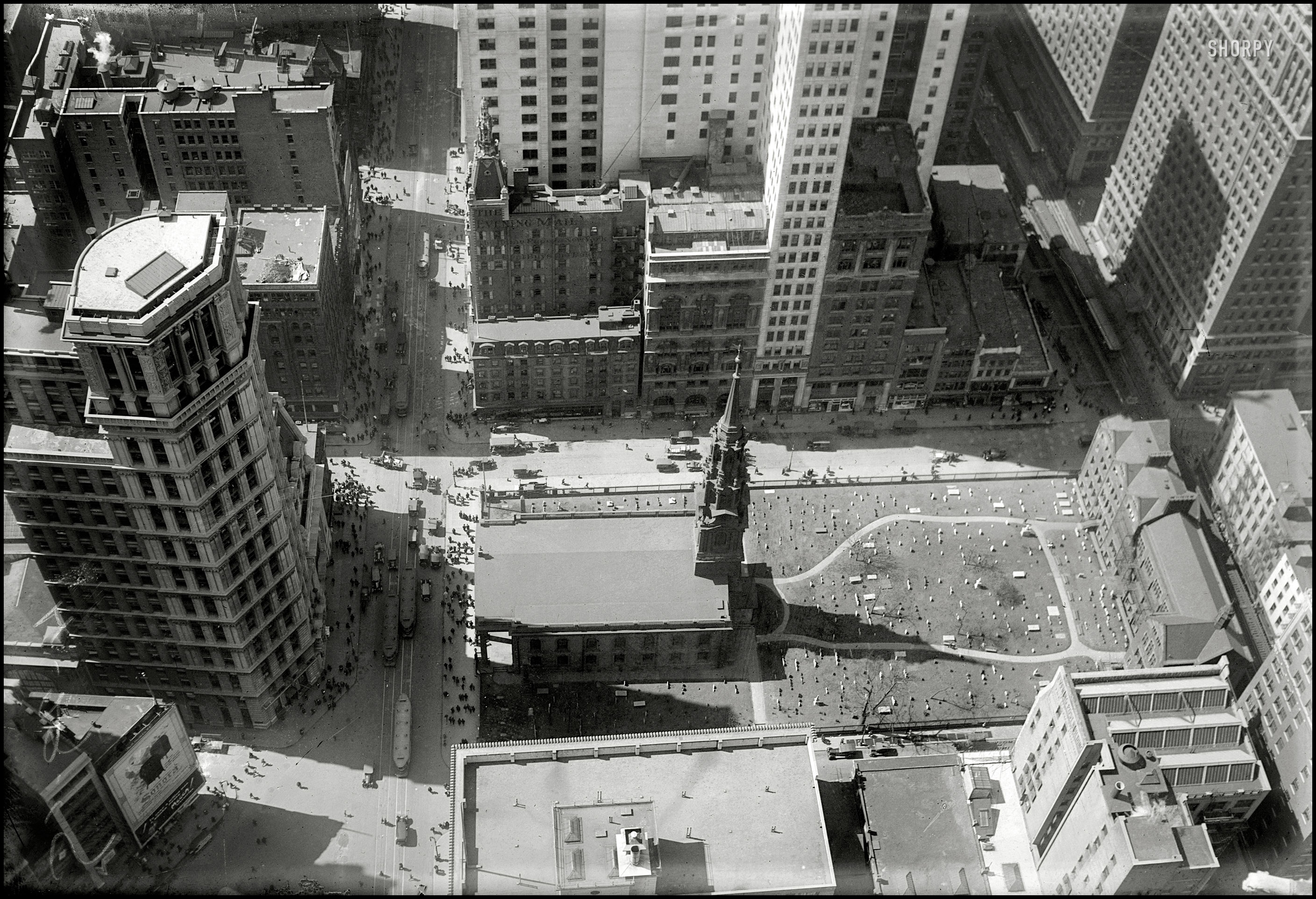 En el centro de la imagen, la pequeña St. Paul’s Chapel (Capilla de San Pablo), construida en 1766, y considerada el edificio religioso más antiguo de la ciudad. A su izquierda – frente a la capilla – podemos ver el edificio del mismo nombre (St. Paul Building). Construido en 1898, fue uno de los primeros rascacielos de Nueva York. En 1958 fue demolido y sustituido por el actual edificio de la Western Electric.