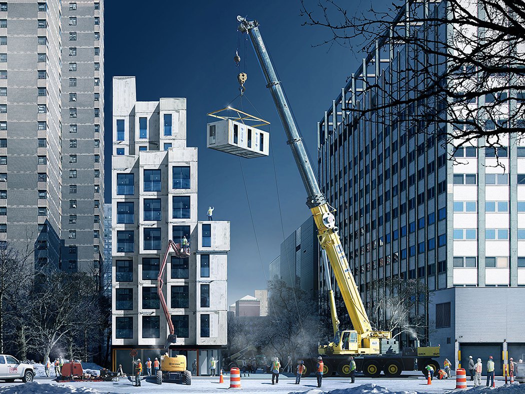 Los módulos han sido prefabricados en las instalaciones que la compañía Capsys posee en el distrito de Brooklyn. Una vez construidos los cimientos y la planta baja e instalados los servicios (agua, luz, gas), los módulos son trasladados al lugar completamente terminados.
