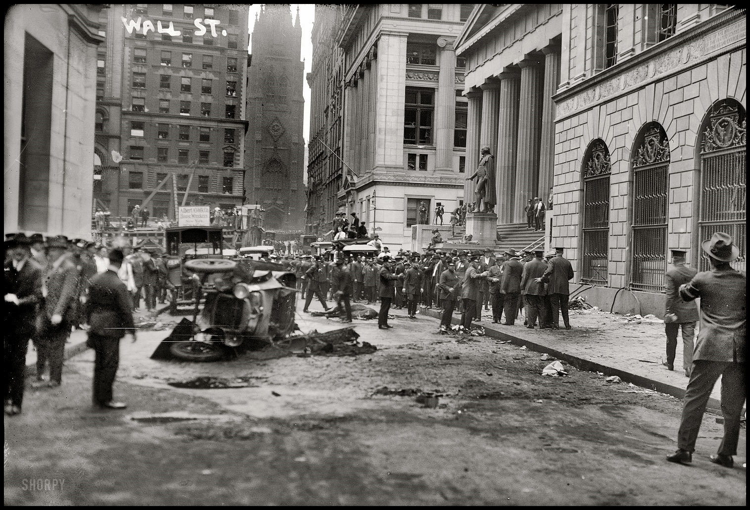 Al filo del mediodía, un carro tirado por caballos es estacionado frente a las oficinas del Banco J.P. Morgan, situado en el nº 23 de Wall Street. En su interior alberga una carga mortal: 45 kilos de dinamita y 230 kilos en esquirlas de hierro.