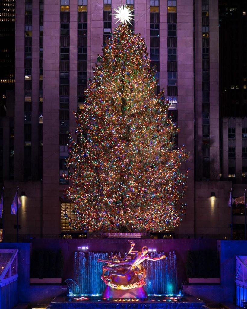 El icónico árbol de Navidad, una tradición que ya cumple 90 años, se encuentra adornado con más de 50.000 luces y coronado con una estrella formada por cristales Swarovski y 408 kilos de peso).